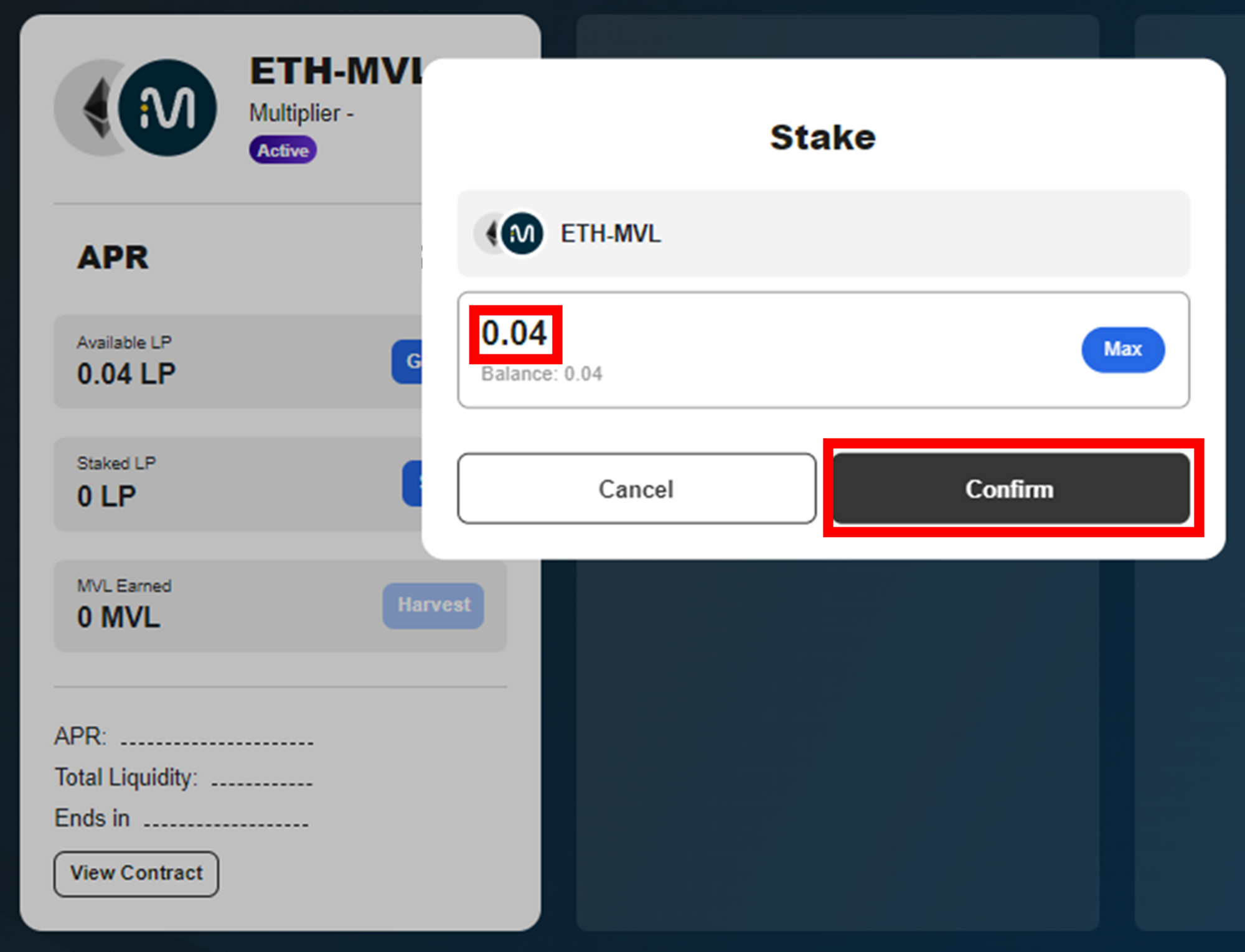 ④ Enter the amount of LP tokens you wish to stake. Then click the [Confirm] button.