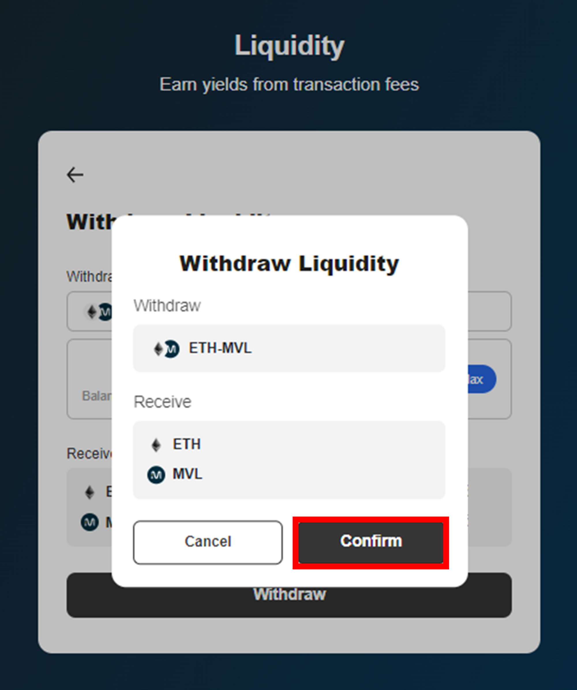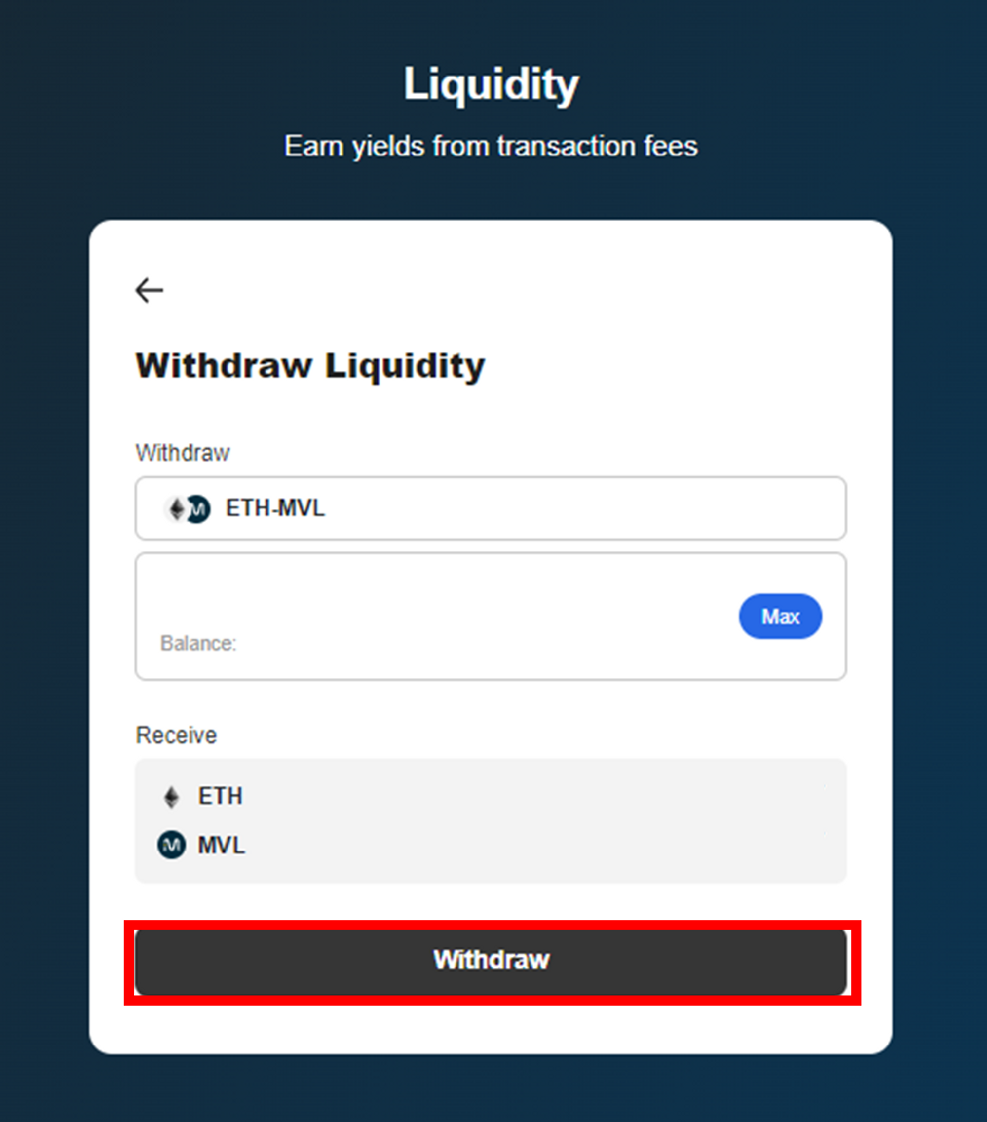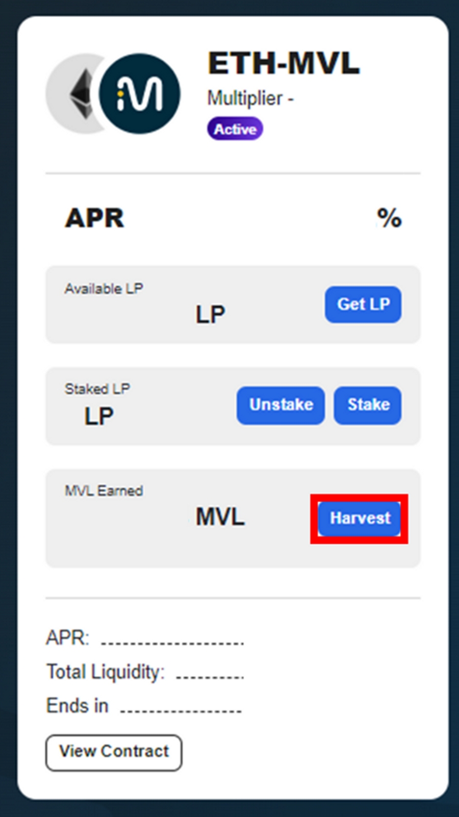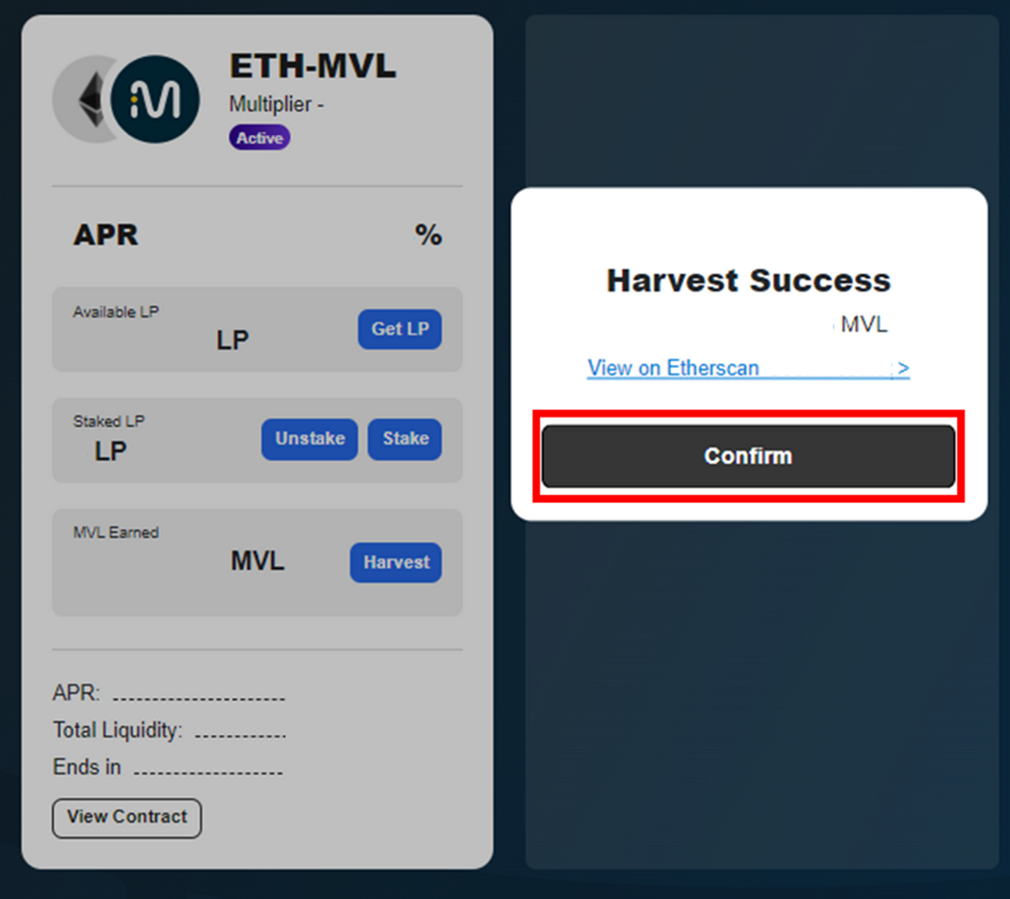 ① If you only want to withdraw rewards(MVL), click the [Harvest] button. A small ETH fee is charged when withdrawing rewards.