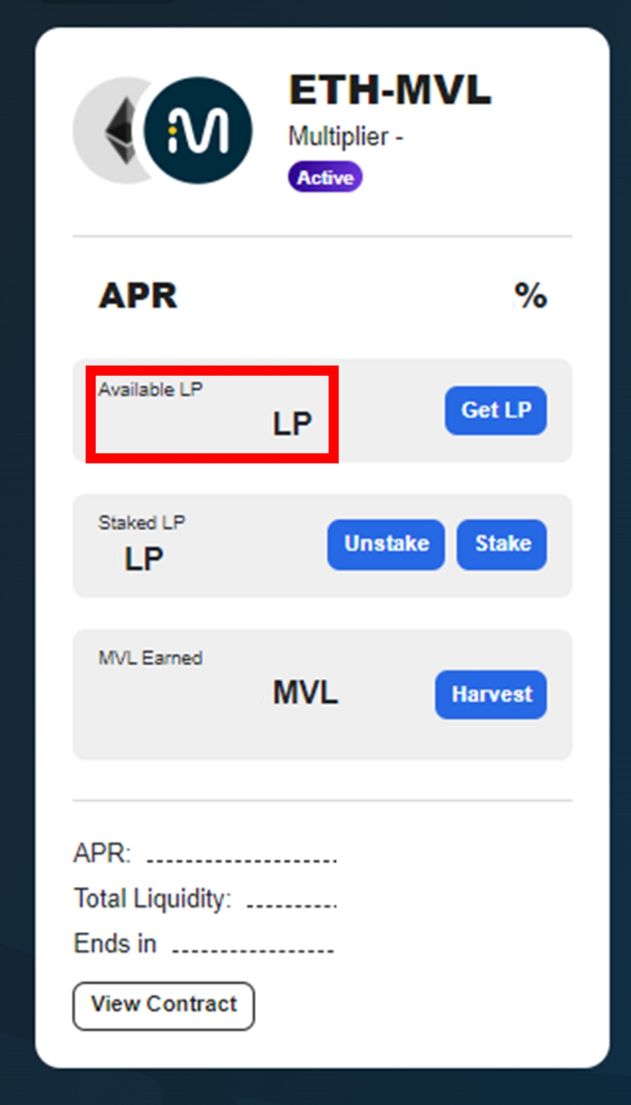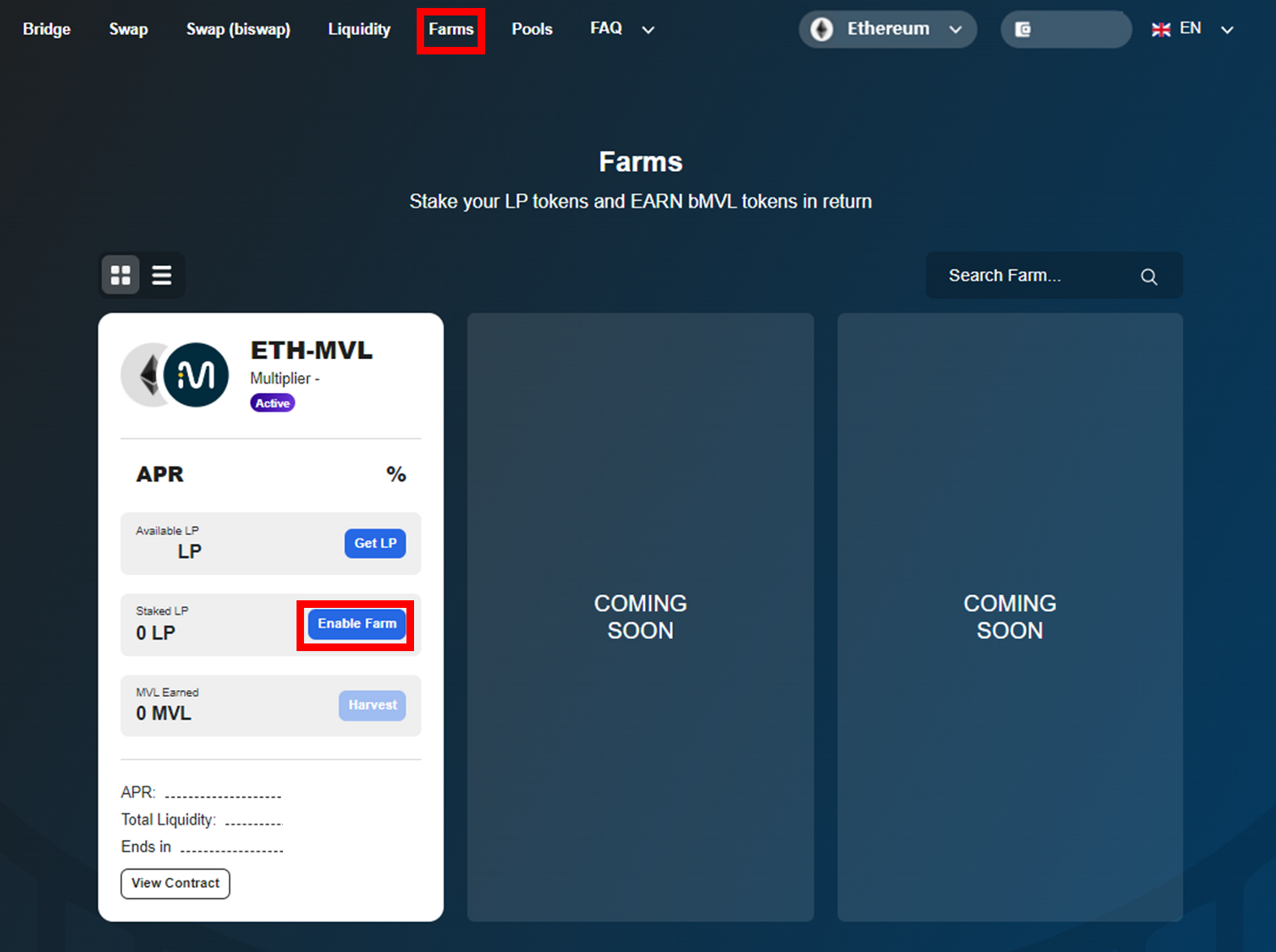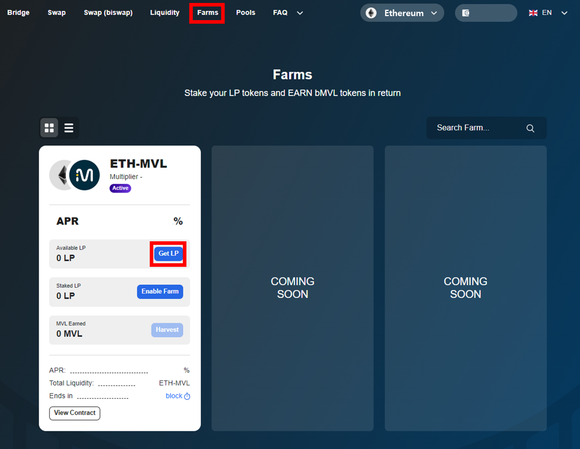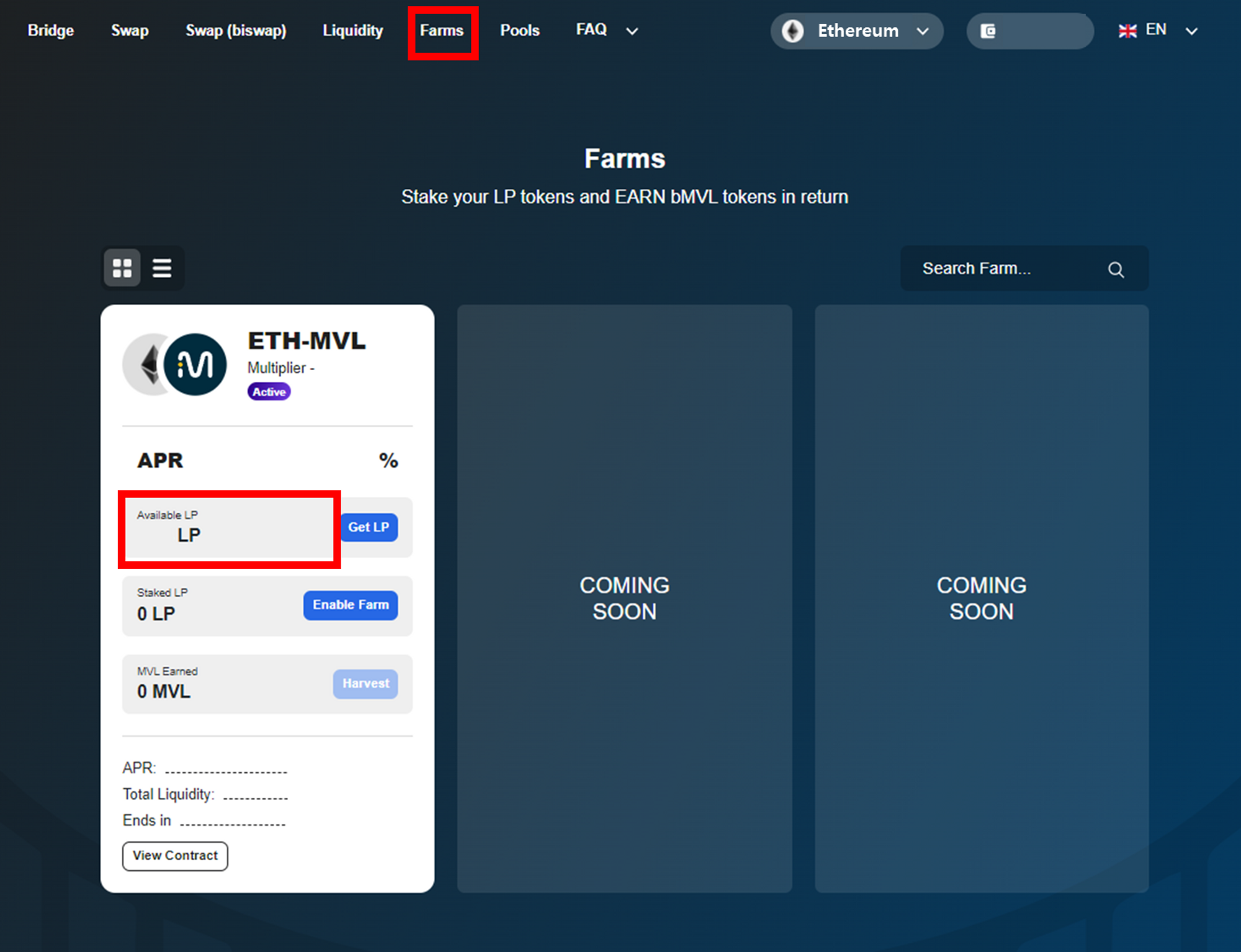 ⑩ Once getting LP tokens is successfully completed, you can check your ETH-MVL LP tokens through [Liquidity] Page → ‘My Liquidity’, and ‘Available LP’ on [Farms] page.