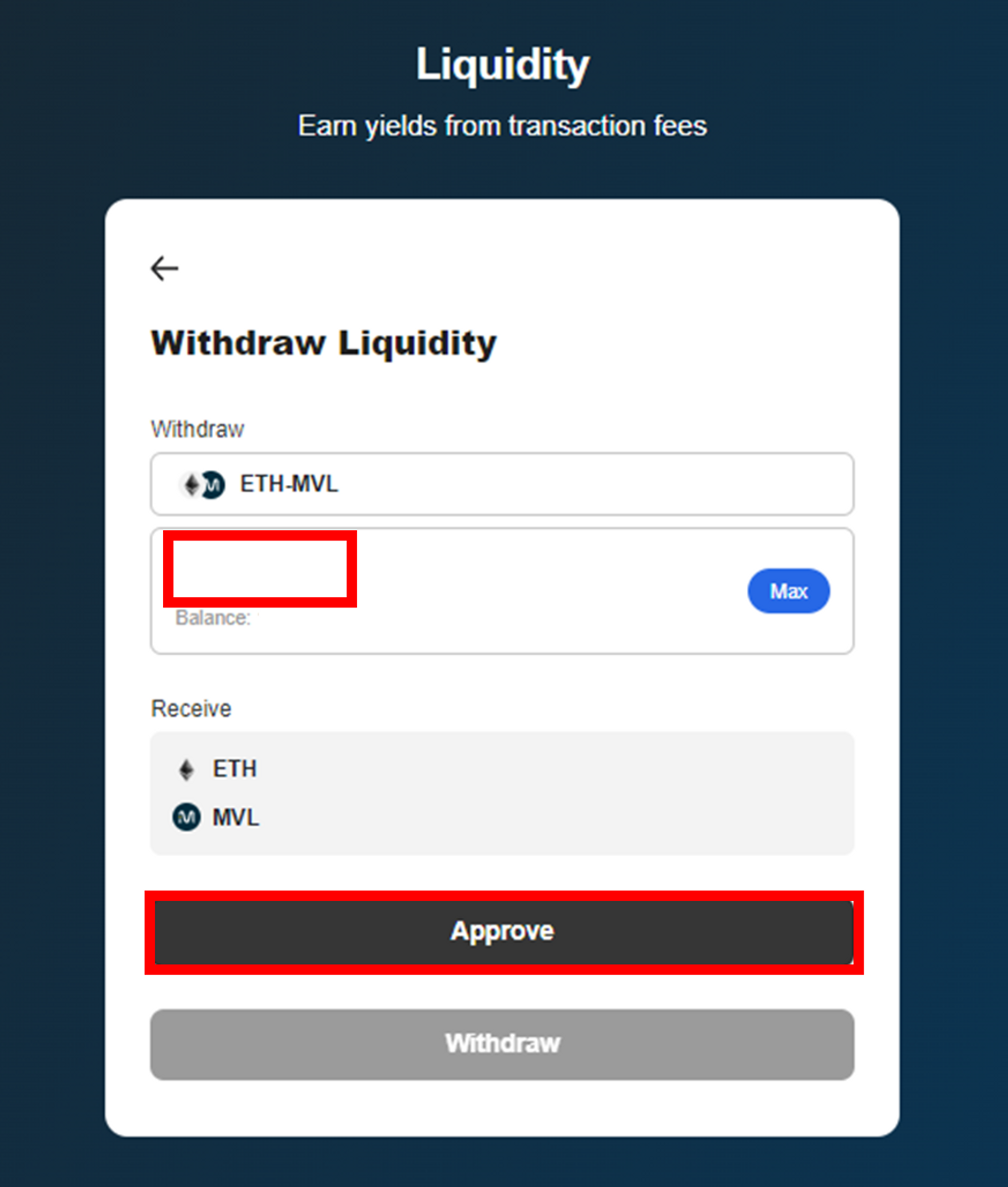 ② Enter the amount of LP tokens you wish to withdraw, then click [Approve] button on ‘Withdraw Liquidty’.