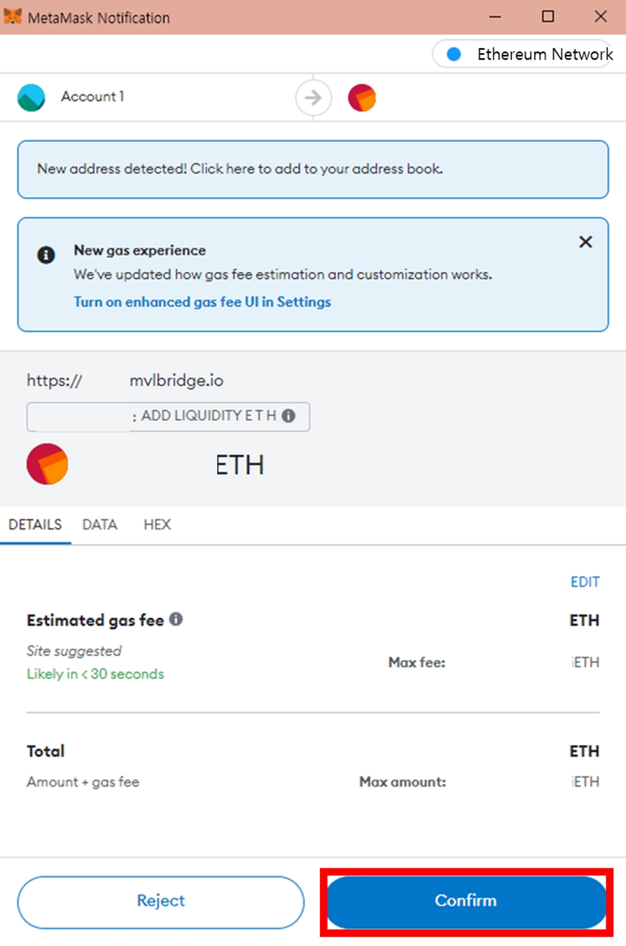 ② Your Metamask wallet will now ask you to confirm the action. Once you have checked the estimated Gas fee, Click [Confirm] button.