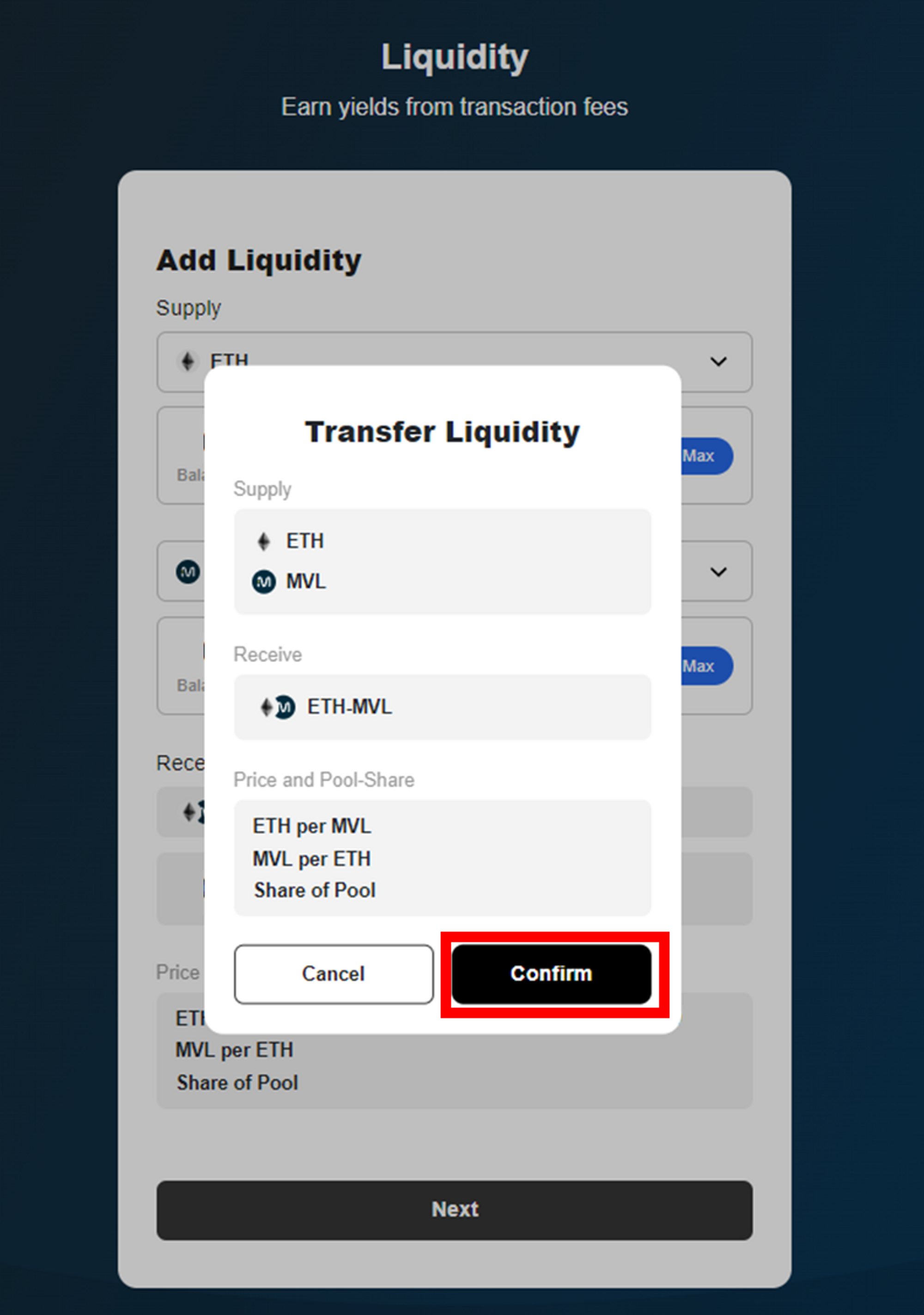 ⑥ Check the amount of LP token you will receive and ETH/MVL you supplied, then click the [Next] button.