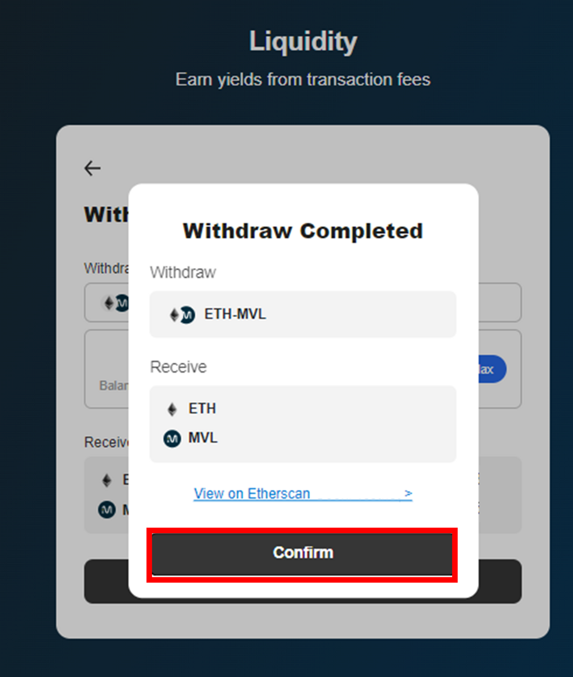 ③ Click the [Confirm] button and receive the principal and rewards. You can check the transaction details on [View on Etherscan]