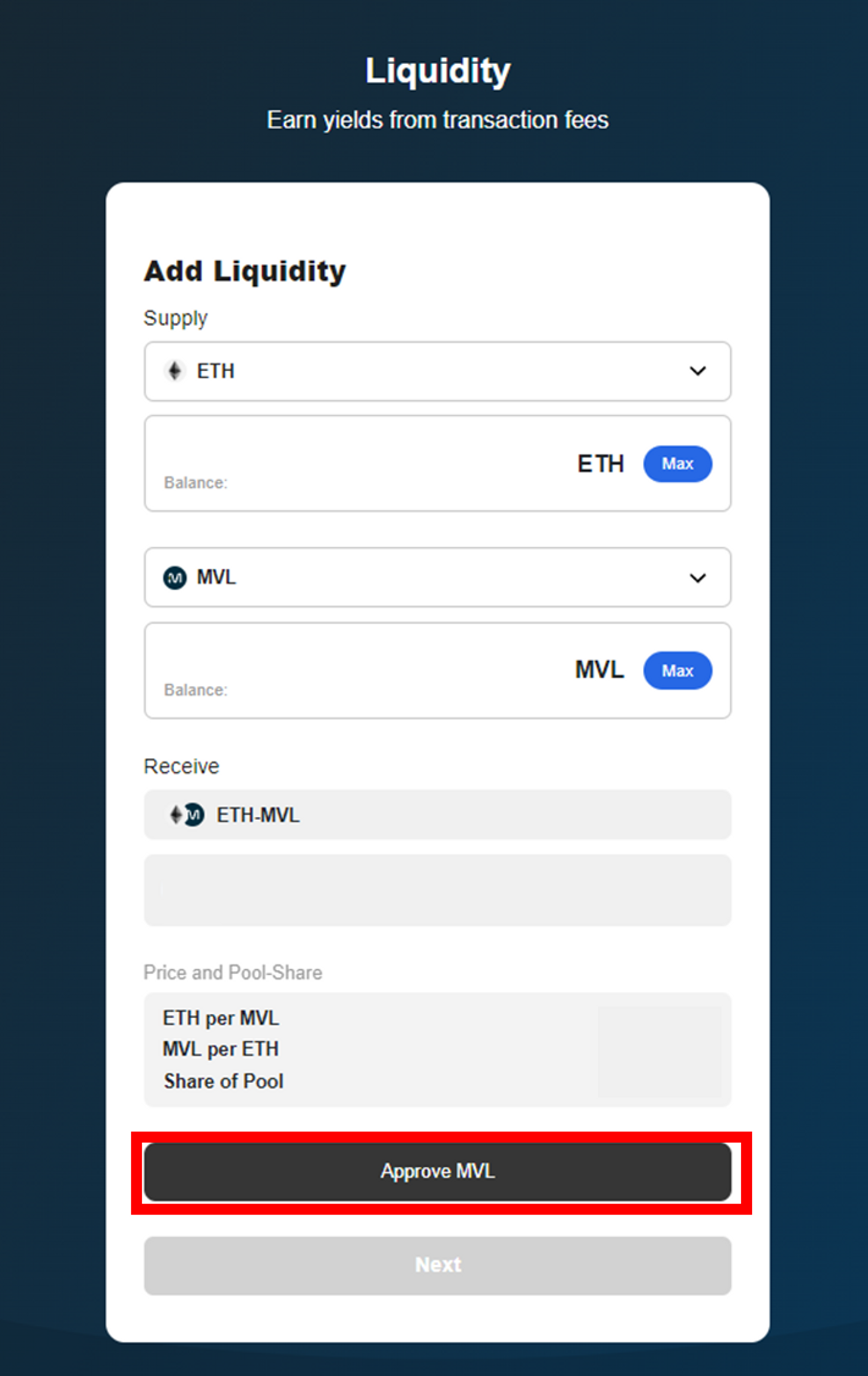 ④ Enter the amount of ETH and MVL in the proportion of 1:1 and check the amount of LP tokens you will receive. Once checked, click [Approve MVL] button.