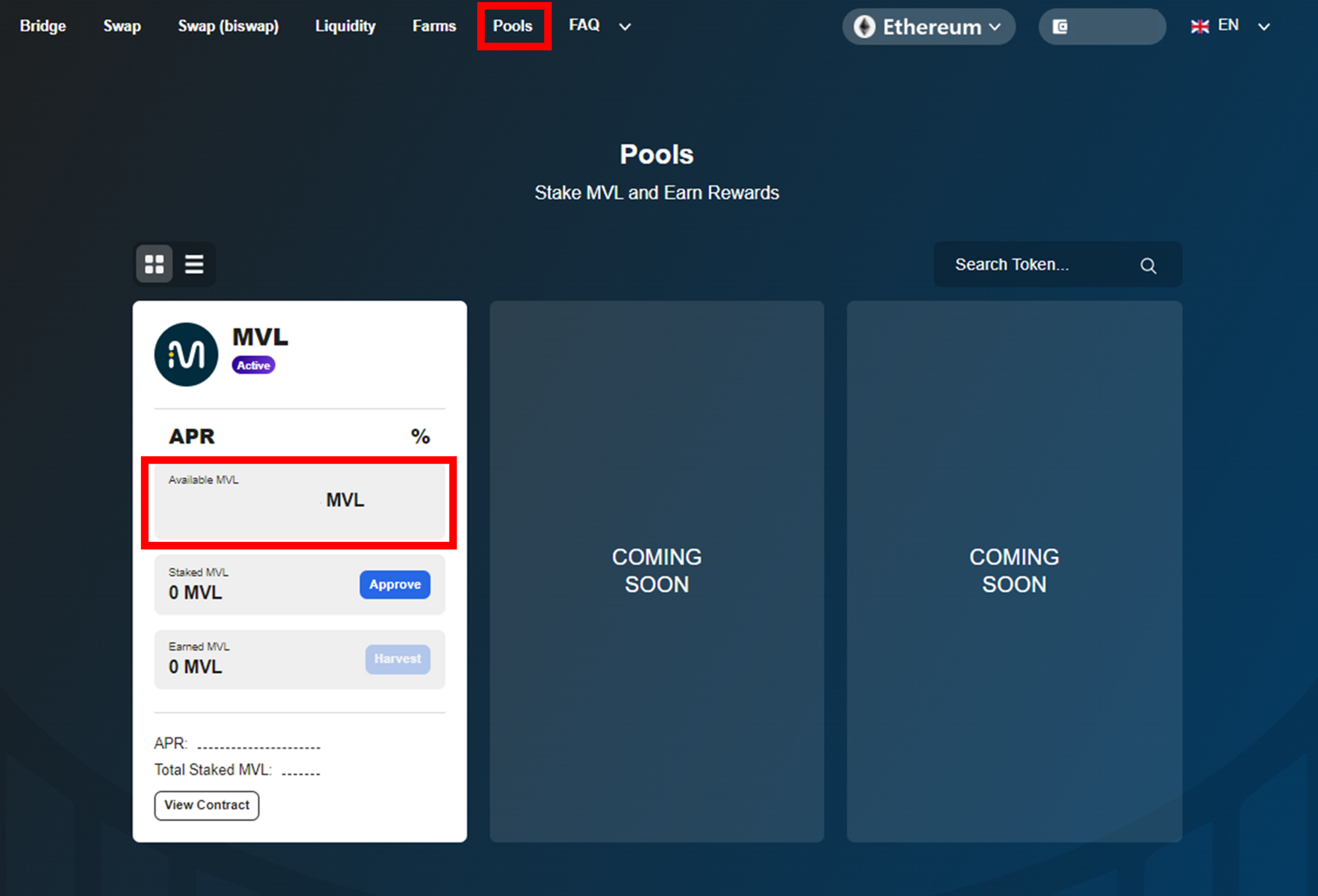 ⑤ You can check your harvested MVL on Metamask wallet, [Bridge] tab, and [Pools] tab.