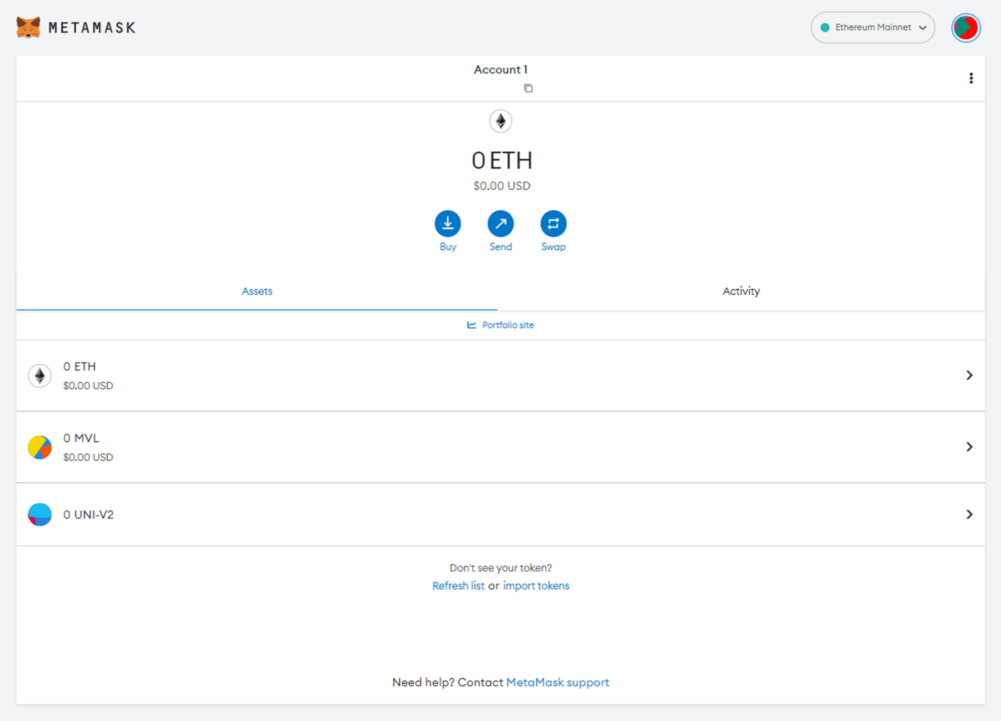 ⑤ You can check your harvested principal(ETH-MVL LP Token) and rewards(MVL) on Metamask wallet, [Liquidity] tab, [Bridge] tab, and [Pools] tab.