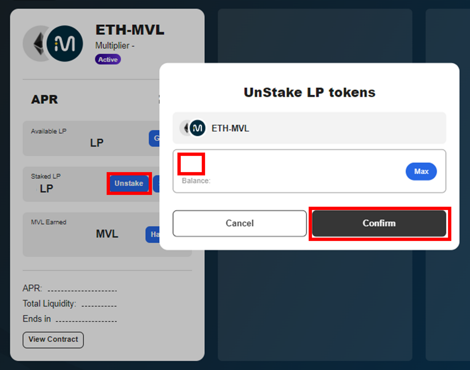 ① To unstake the LP tokens, Click [Unstake] button, then enter the amount of LP tokens you wish to unstake.