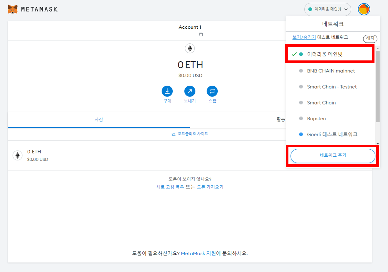 ① 네트워크를 이더리움 메인넷을 선택하고 메타마스크 지갑에서 “토큰 가져오기”를 클릭하세요.