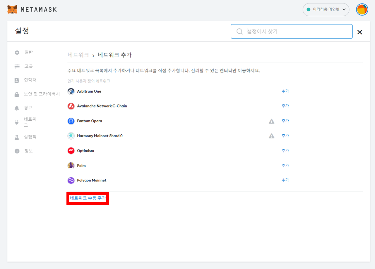 ① 이더리움 메인넷으로 설정되어 있는 네트워크 버튼을 클릭하세요.