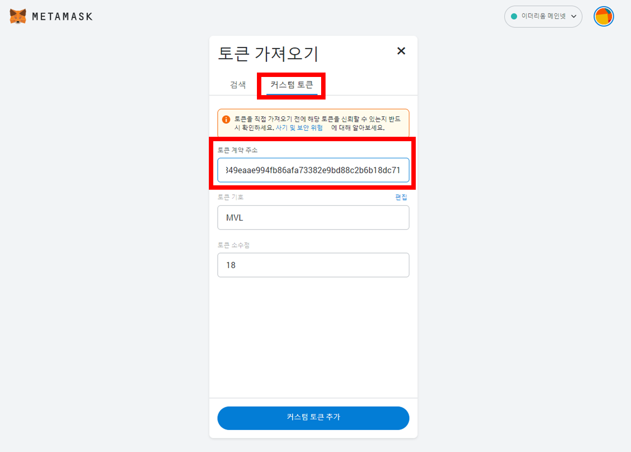 ② “커스텀 토큰 탭”에서 토큰 계약 주소에 아래 MVL ERC20 컨트랙트 주소를 입력하세요.