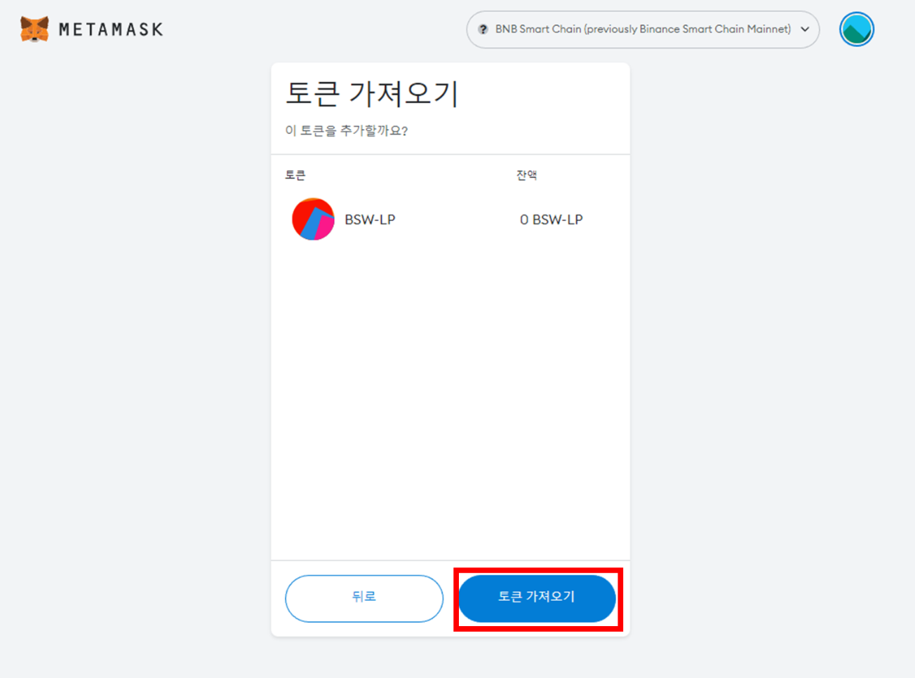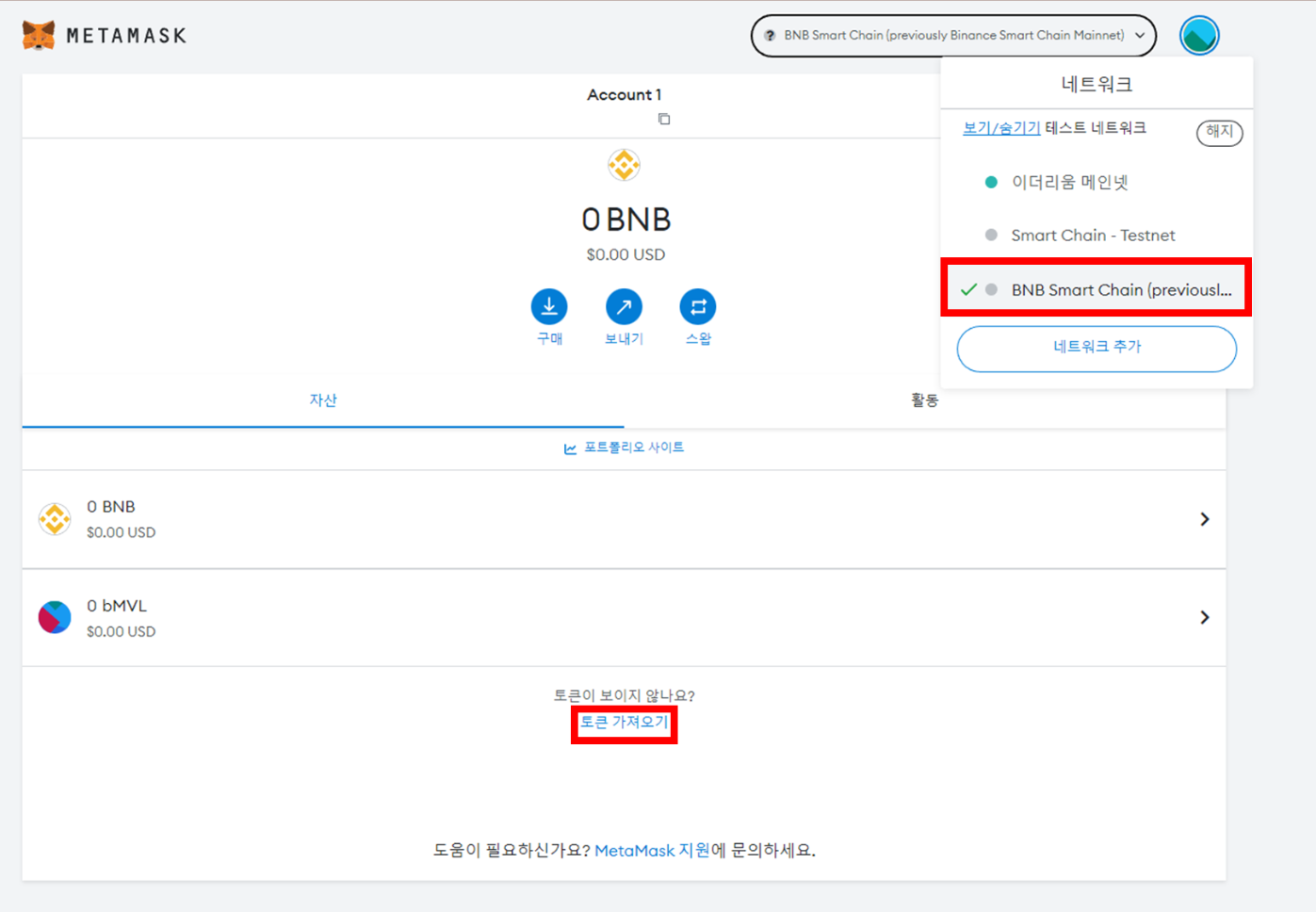 ① 네트워크를 바이낸스 스마트 체인을 선택하고 메타마스크 지갑에서 “토큰 가져오기”를 클릭하세요.