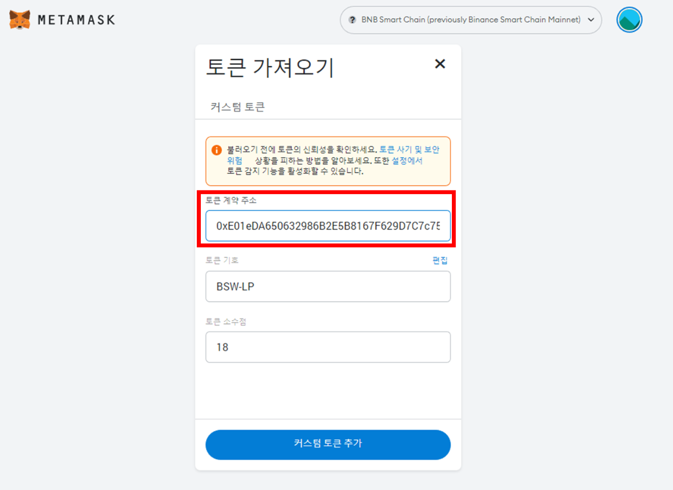 ② “커스텀 토큰” 탭에서 토큰 계약 주소에 아래 BSW-LP컨트랙트 주소를 입력하세요.