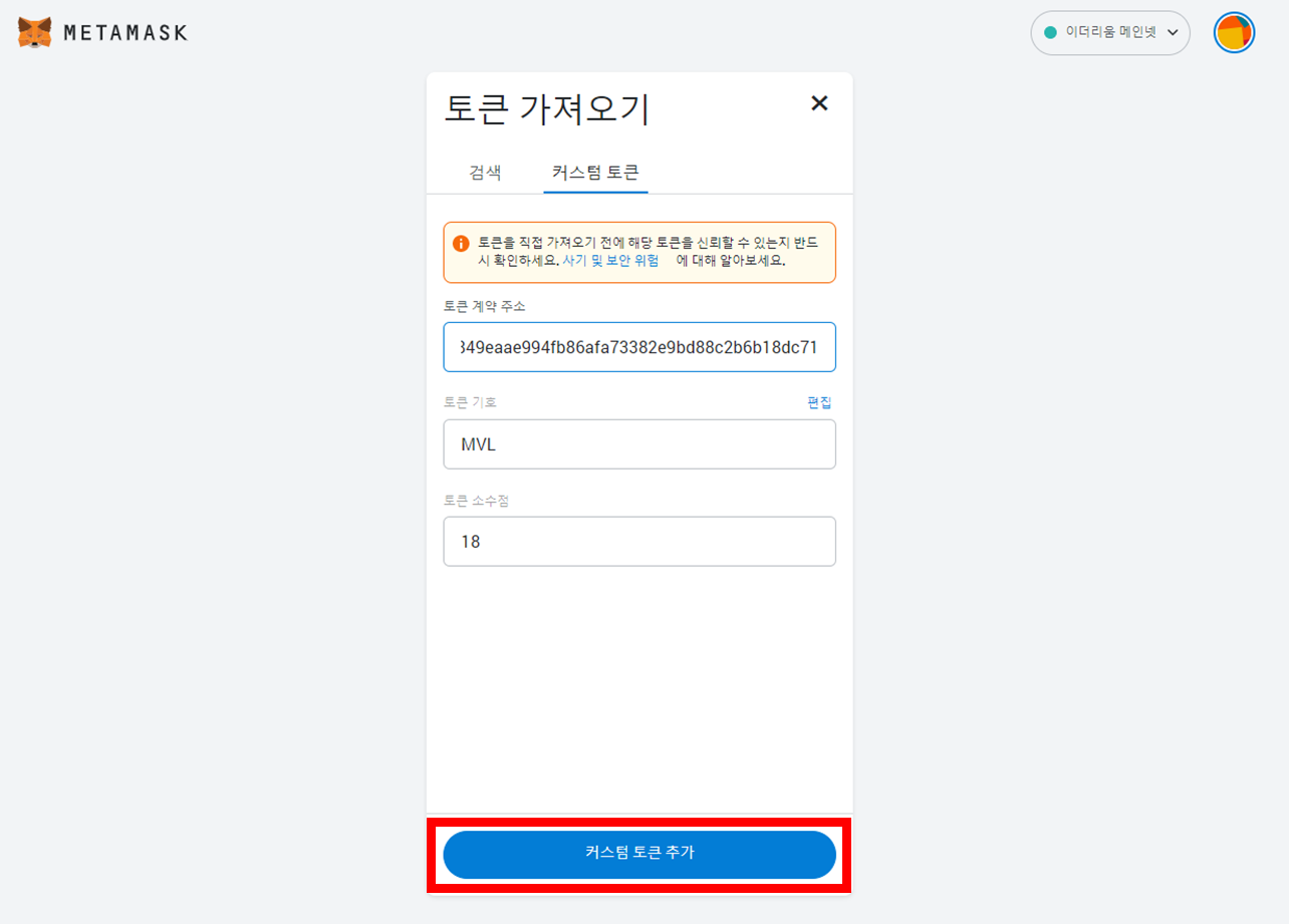<mark style="color:red;">**※ MVL 토큰을 추가해야 메타마스크에서 보유한 MVL 토큰 물량을 확인할 수 있습니다.**</mark>
