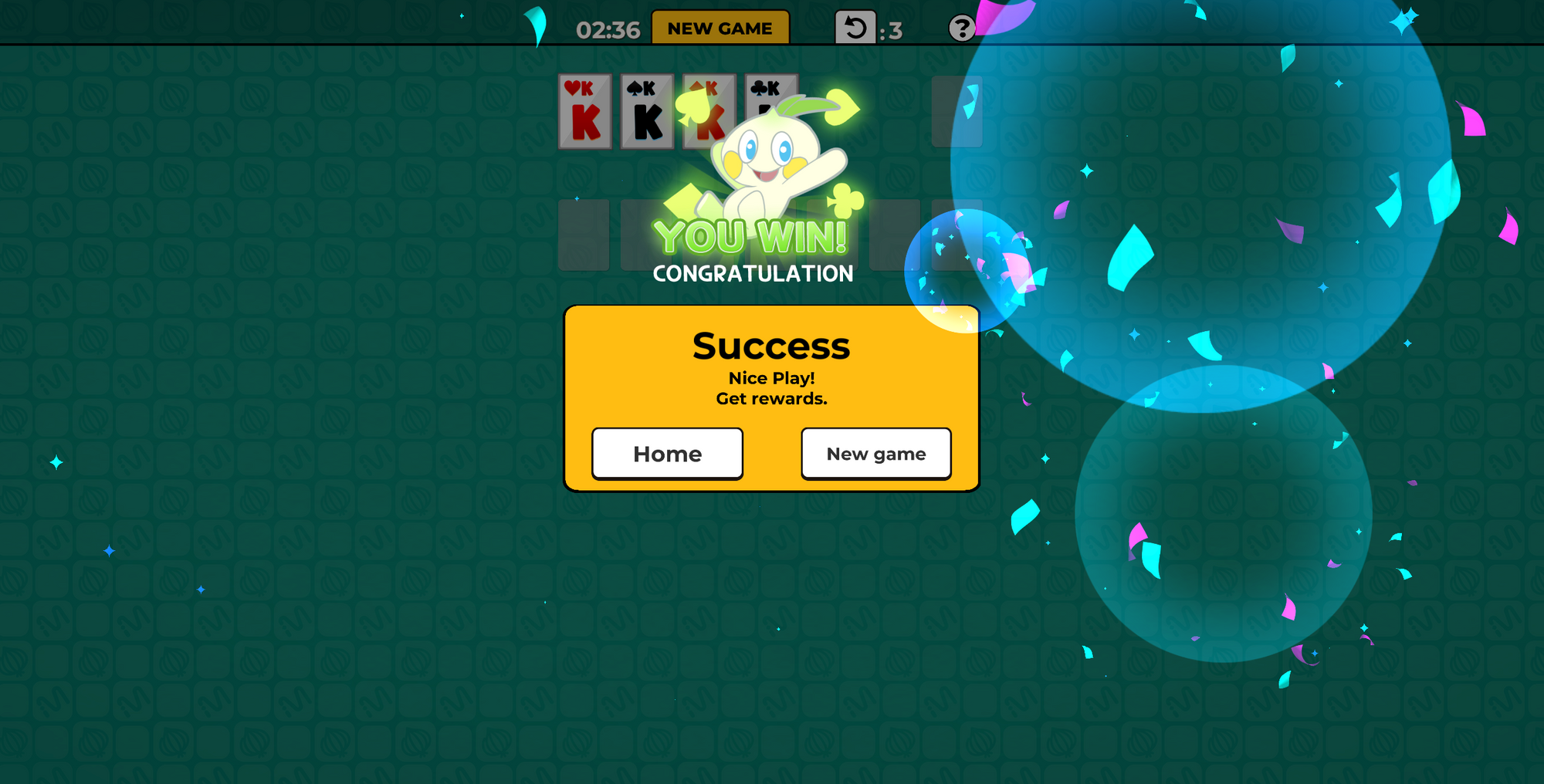 **스톡 더미와 웨이스트 더미가 없는 상태에서 오픈되지 않은 카드를 모두 오픈하면 자동으로 모든 카드가 파운데이션 카드 더미로 옮겨집니다.** 그리고 게임이 종료됩니다.