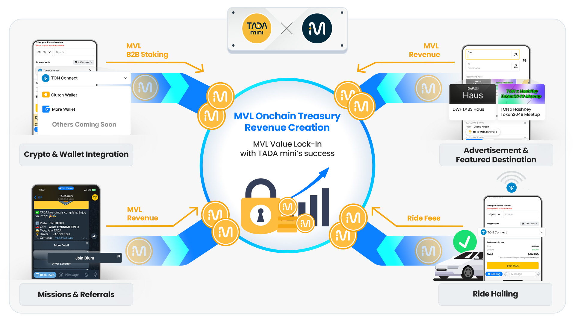 To drive further growth for MVL, various project tokens will be onboarded to TADA mini. As payment support for these tokens is implemented, there will be demand for enterprise (B2B) staking, while also generating continuous fee revenue through individual trips.
