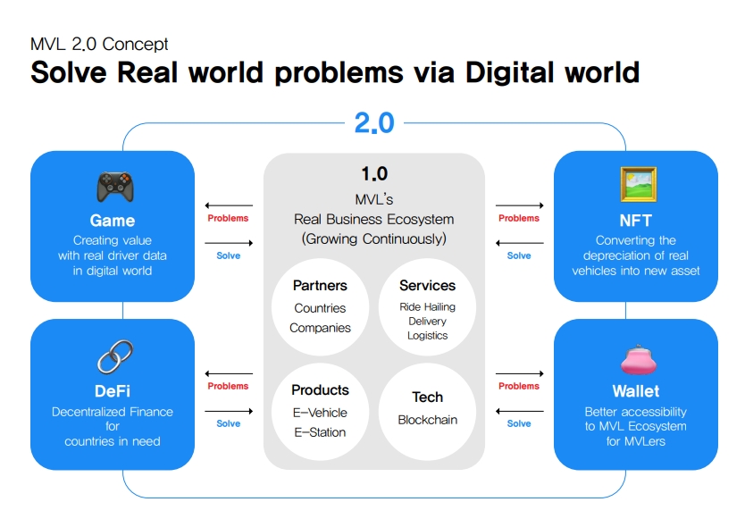 With the slogan of “Solve Real World Problems via Digital World,” the MVL 2.0 Concept Paper includes MVL's missions and blockchain utilized solutions for MVL to solve in the mobility industry through four concepts: Wallet, De-Fi, NFT, and Game.