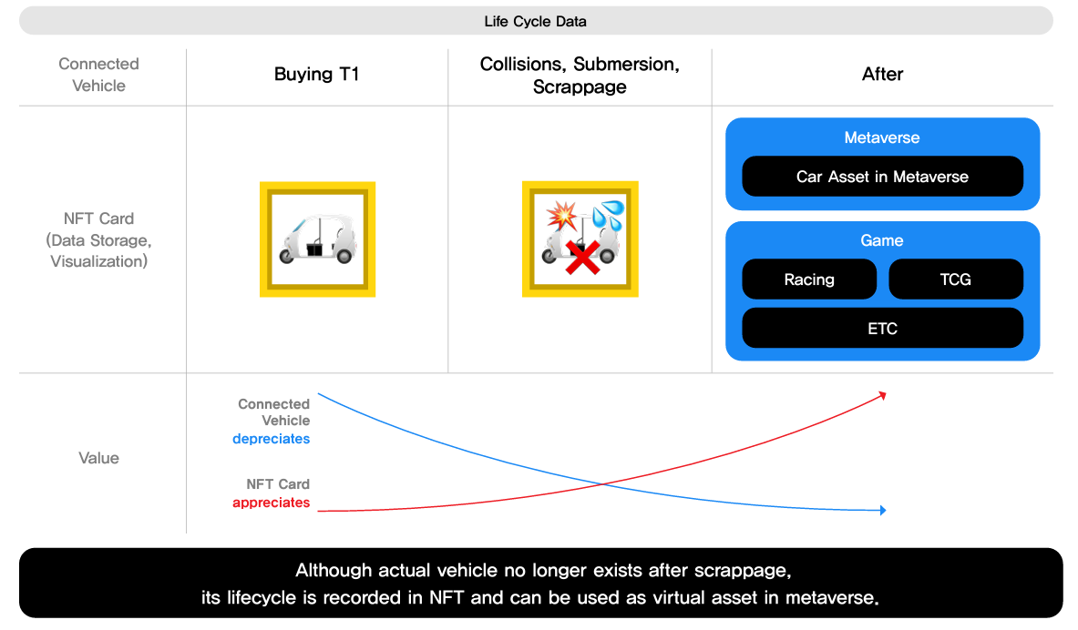 If a vehicle, which cannot be a means of storing value, combines with NFT, a means of storing value, we can find the possibility of transforming depreciable vehicles into an asset that increases their value.
