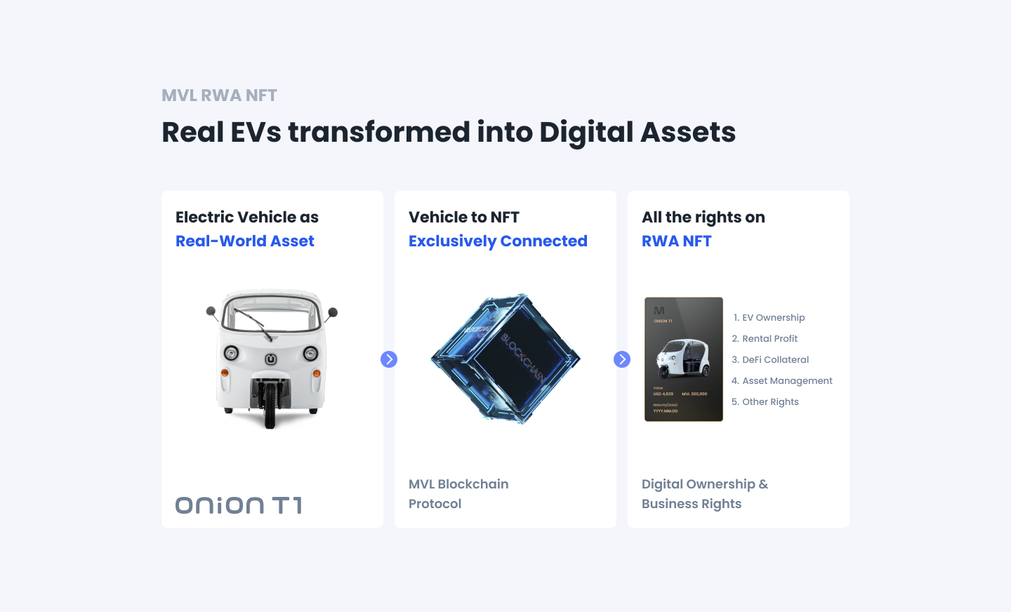 Moreover, all our ONiON vehicles deployed across Southeast Asia are connected vehicles, ensuring that essential ownership data, such as real-time location, mileage, and relevant certificates, are effortlessly incorporated into the MVL protocol. Furthermore, as these vehicles are leased to local TADA drivers, their monthly payments—comprising financial data—are also integrated into the NFT ecosystem.