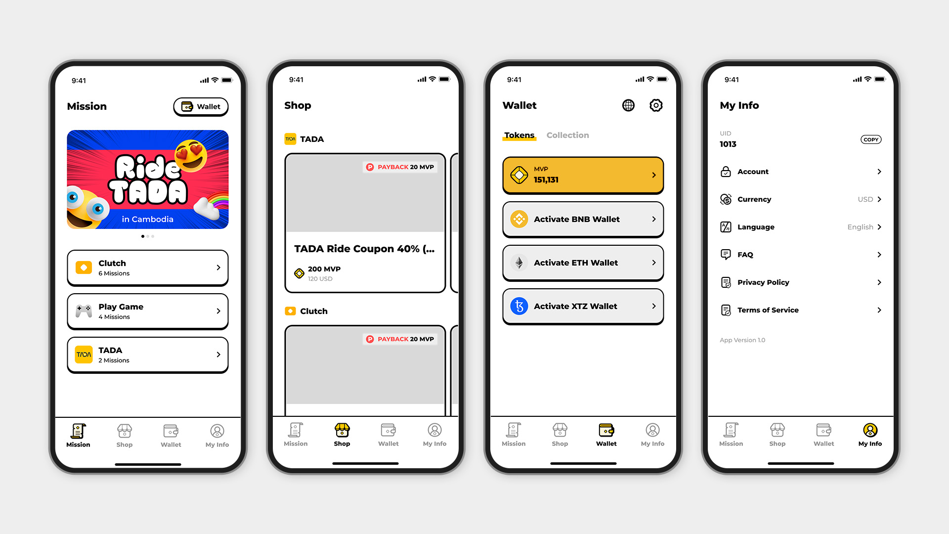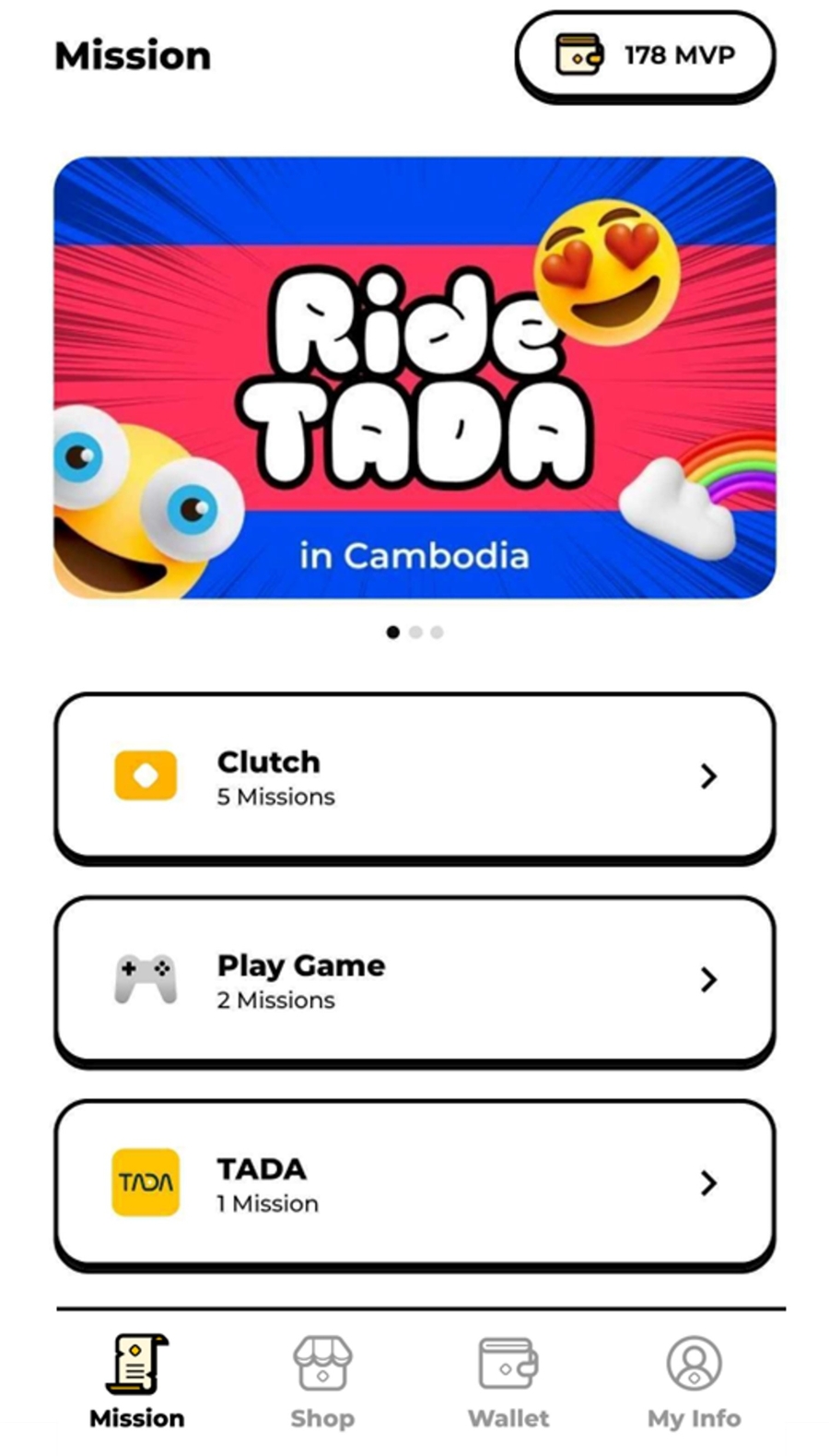 A: We encourage users to explore the mission function and strive to achieve MVP status daily. MVP points, equivalent in value to bMVL, can be easily earned by completing the missions we offer. These MVP points can be accumulated and used in our shop tab. We recommend purchasing a TADA coupon and utilizing it when using TADA services in Cambodia. Additionally, we have plans to introduce more missions in the future, so stay tuned for exciting updates!